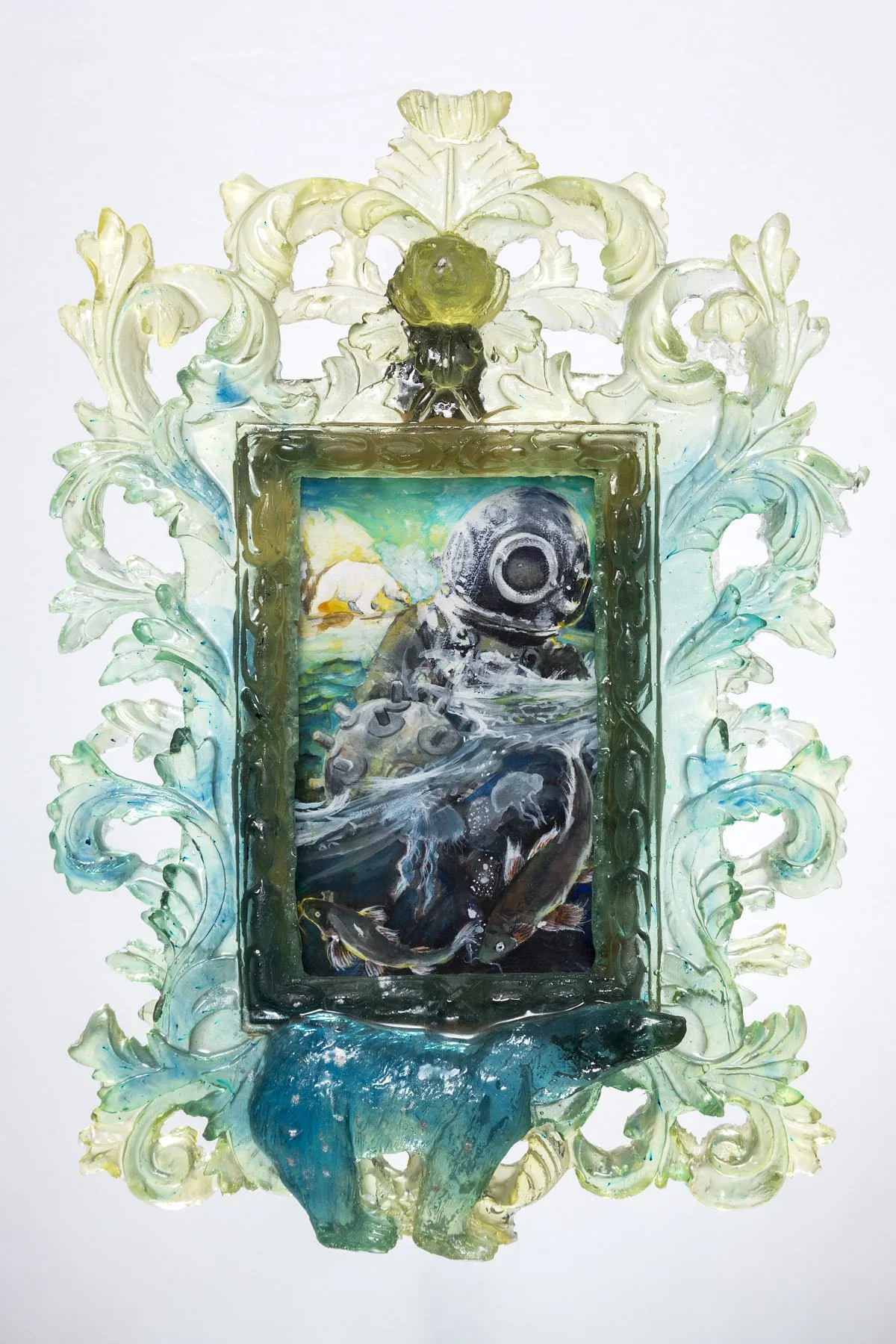 Gouache painting of person in diving suit in water