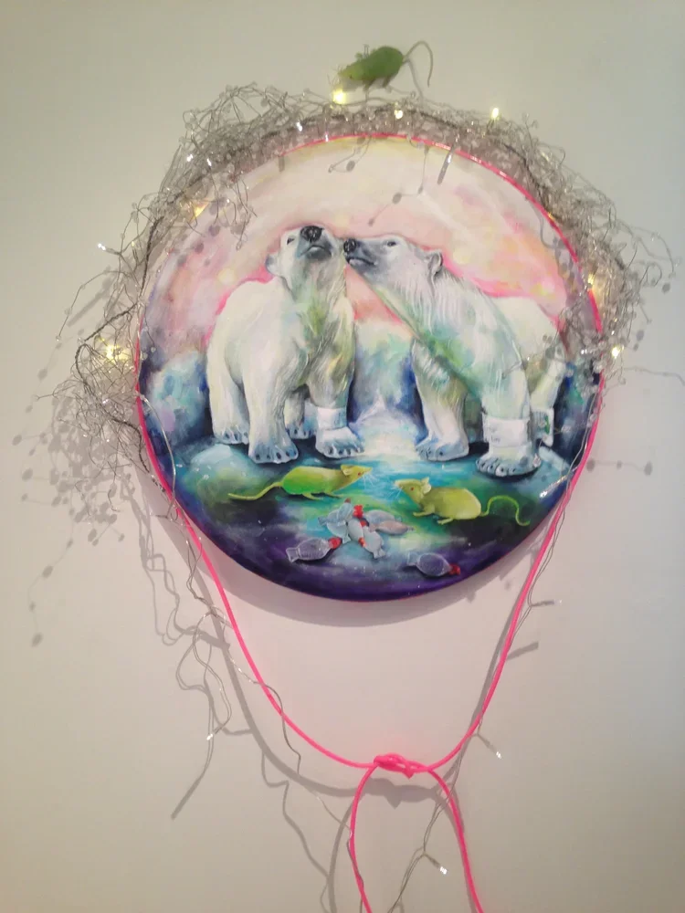 Along our watery border we witness the interaction of urbanisation on the ocean. From this frontier ocean currents collect, dispatch, disperse and deposit litter worldwide. Plastic marine debris affects at least 267 species worldwide, including man. Creatures such as polar bears seem exotic, foreign and irrelevant to life here, only to sighted in a National Geographic in a doctor’s waiting room, or as ornamental figurines, or visited shacked up in air-conditioned comfort on the Gold Coast. But objects we dwellers of the metropolis nonchalantly dispose of greatly effect their survival. Everything is interdependent. Everything is interlinked. These paintings contemplate on how what we do in our small nook of the globe impacts and connect with a vaster world